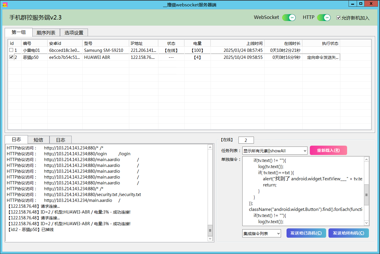 可以自定义代码,存成单独的文件,可以在主界面,选择要执行的脚本,可以单发群发给上线手机