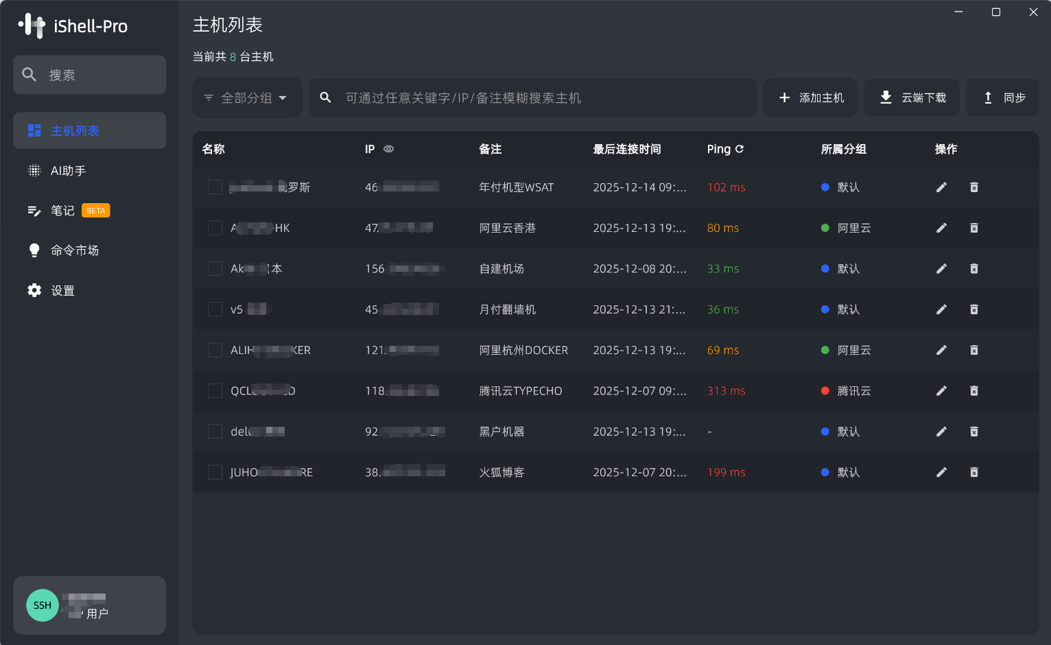 CPU、内存、任务、自定义命令、SFTP、云同步、大文件查找、流量监控、代理、本地终端、ZModem、云脚本,采用强加密保证数据安全,原生开发,超高性能